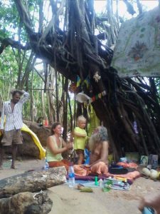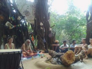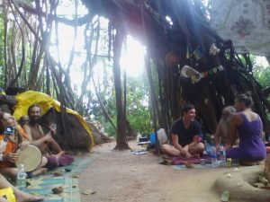 Arrivammo al luogo santo del Baba di Arambol, dove altri viaggiatori provenienti da diversi luoghi del mondo, ma soprattutto russi, ci avevano preceduti. Qualcuno sembrava essersi trasferito lì, come una giovane ragazza che sembrava molto su di giri. Ricordo che mi fece una certa impressione. Erano tutti in cerchio, il Baba di Arambol adagiato sotto un maestoso banyan, albero capace di formare un’intera foresta. Sacro a Shiva, adornato di mandala tessuti a mano, bandierine tibetane e doni. Una coppia, lei matura e lui un po’ più giovane, intonò una melodia con l’ukulele diluendo quell’energia densa. La sensibilità sottile dei musicisti.