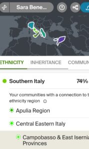 Sono passati dall’Italia Etruschi, Greci nel sud, tedeschi nel nord. Come cuore del Sacro Romano Impero e Culla del Rinascimento, l’Italia ha ricevuto un’eredità artistica e culturale di un certo rilievo. Non esiste un italiano puro: siamo il frutto delle migrazioni dei nostri antenati. Secondo il test i miei parenti del sud Italia provengono da Puglia e Campania. Infatti miei nonni sono salentini ed una bisnonna campana.