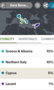 Ebbene sì, secondo le ricerche del momento, sono italiana, sud al 74%, con una percentuale di dna da Grecia e Albania, Cipro e… new entry Levante. Questo mi ha emozionata e stupita perché mi sono sempre sentita connessa a quell’area del mondo, ma era qualcosa di talmente intimo che non lo condividevo.