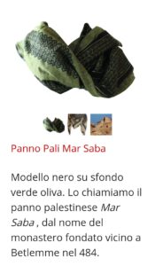 Invito a fare un giro sul sito ufficiale kufiya.org ed esplorarlo, guardare il cortometraggio sulla storia della manifattura e tutte le kaffiyehs in vetrina perché oltre a quelle tradizionali, che sono bellissime, ce ne sono di moderne e colorate e le descrizioni sono molto significative e toccanti. Ciascuna ha il suo nome: c’è Shami Khufiya, prevalentemente utilizzata in Siria e altri Paesi Arabi. Oppure Lavender con le tonalità lavanda e della terra. Qui sotto Mar Saba: