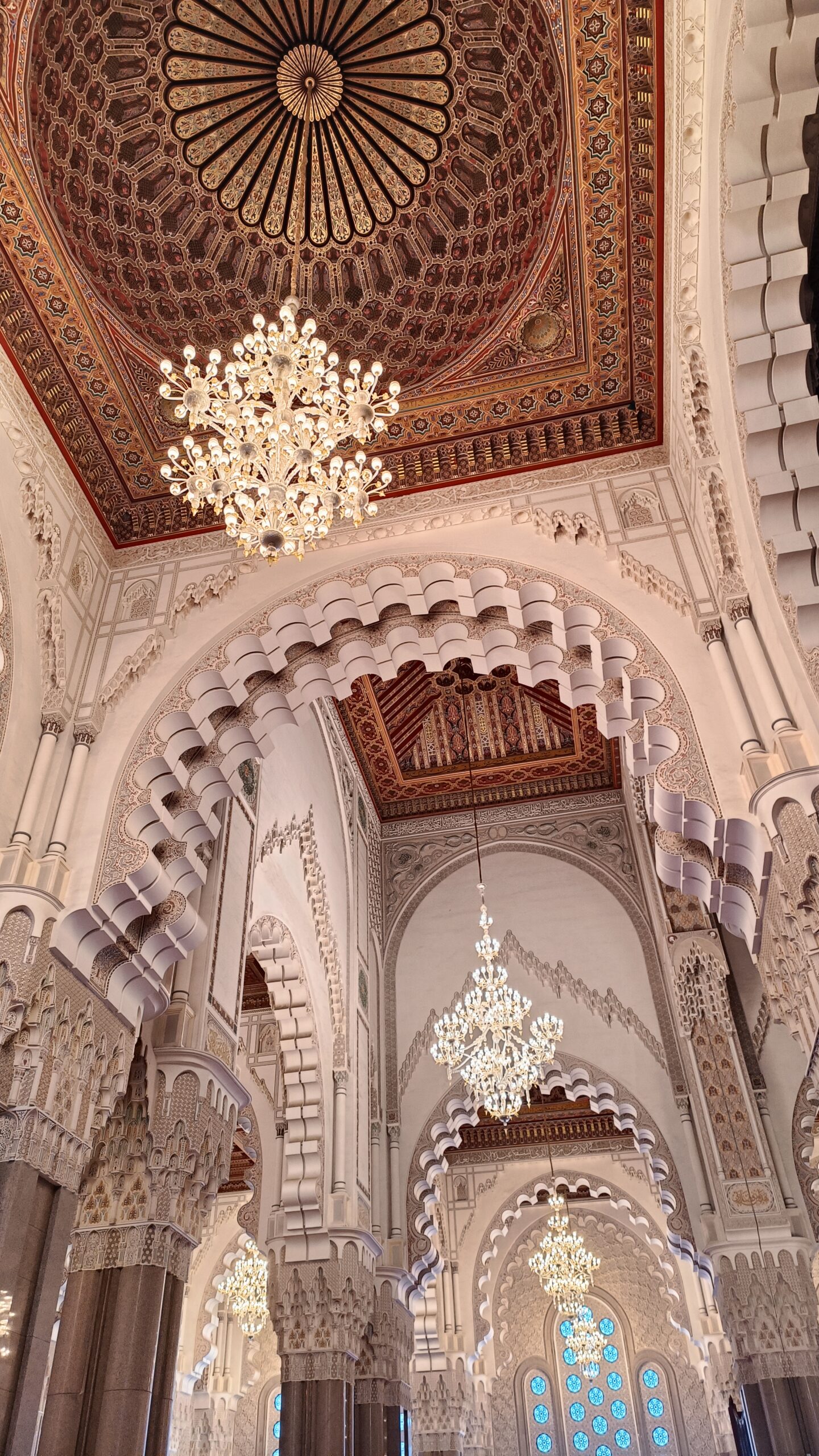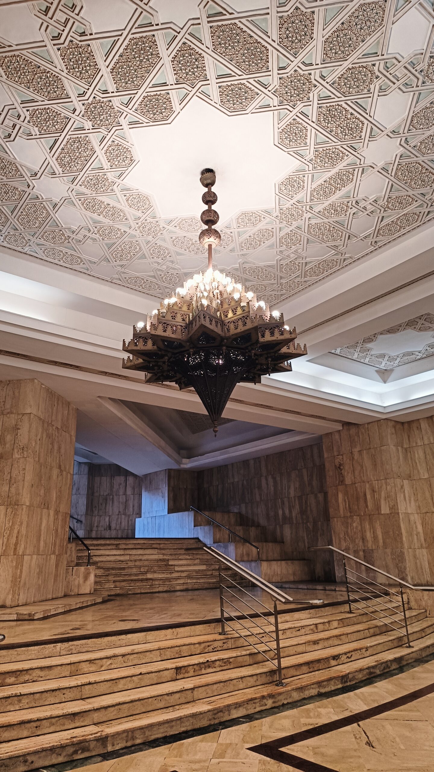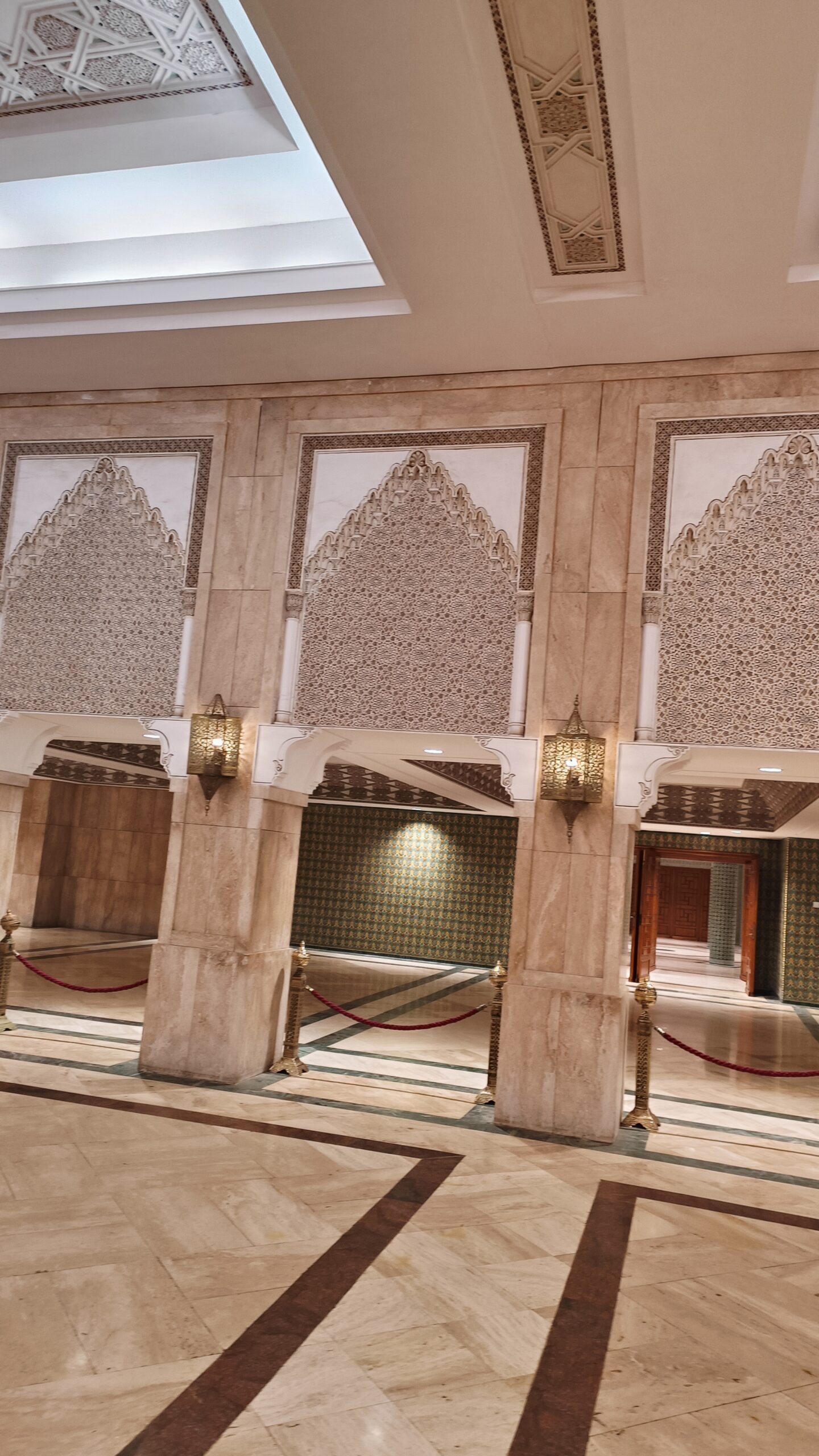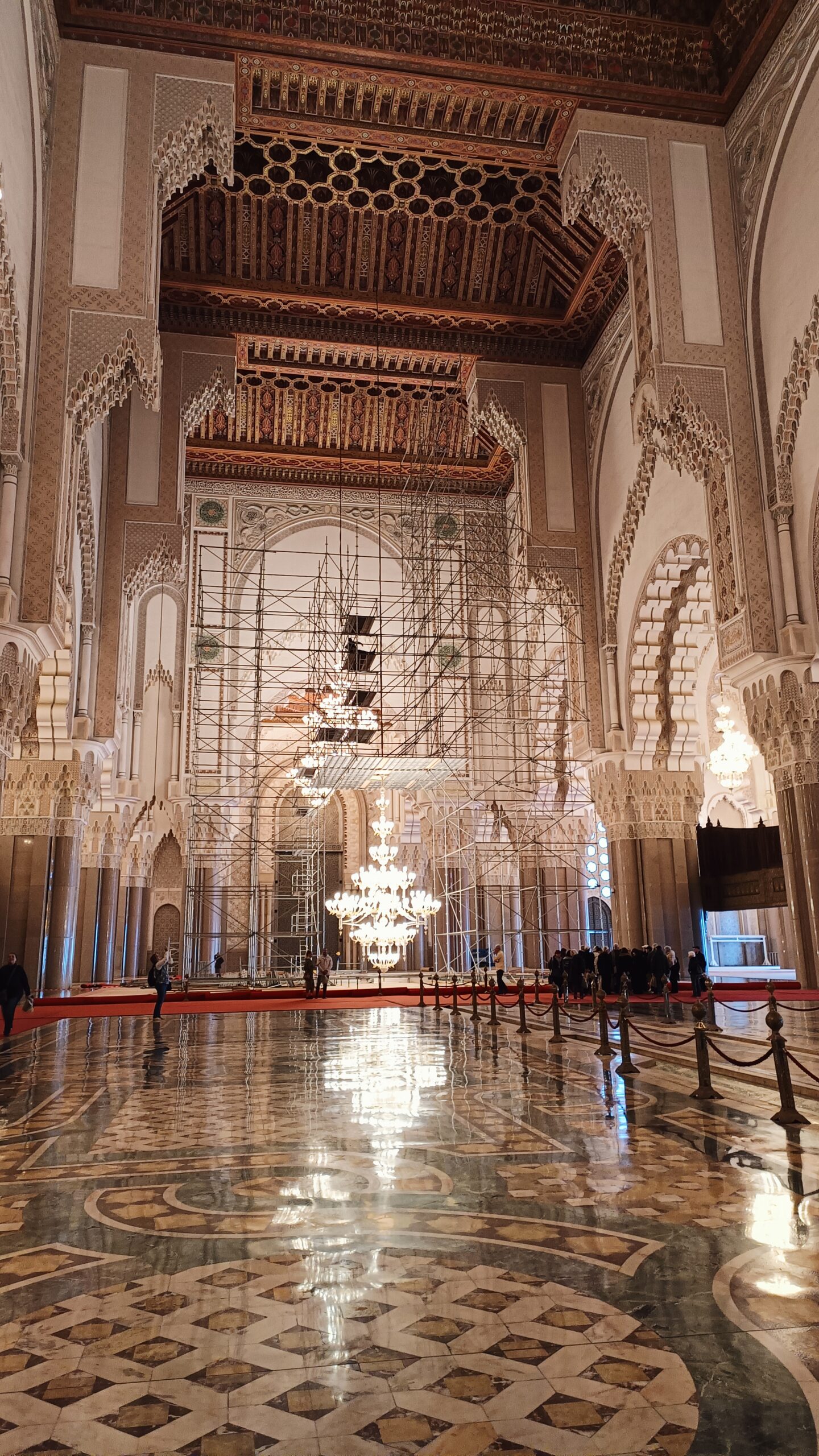 La guida, purtroppo ho scordato il nome, ci ha accompagnato con grande professionalità alla scoperta di questa imponente costruzione super tecnologica. La moschea è dotata di pavimento riscaldato e tetto apribile per i periodi più caldi. Abbiamo assistito alla manutenzione di alcuni lampadari, che visti a terra. da vicino, sono enormi. Per poi visitare la sala della preghiera, immensa con i suoi 20.000 mq, e finemente decorata. Tutti i materiali utilizzati per la costruzione della moschea sono marocchini, come il granito rosa di Agadir e il legno di cedro del Medio Atlante, fatta eccezione per i lampadari di Murano.