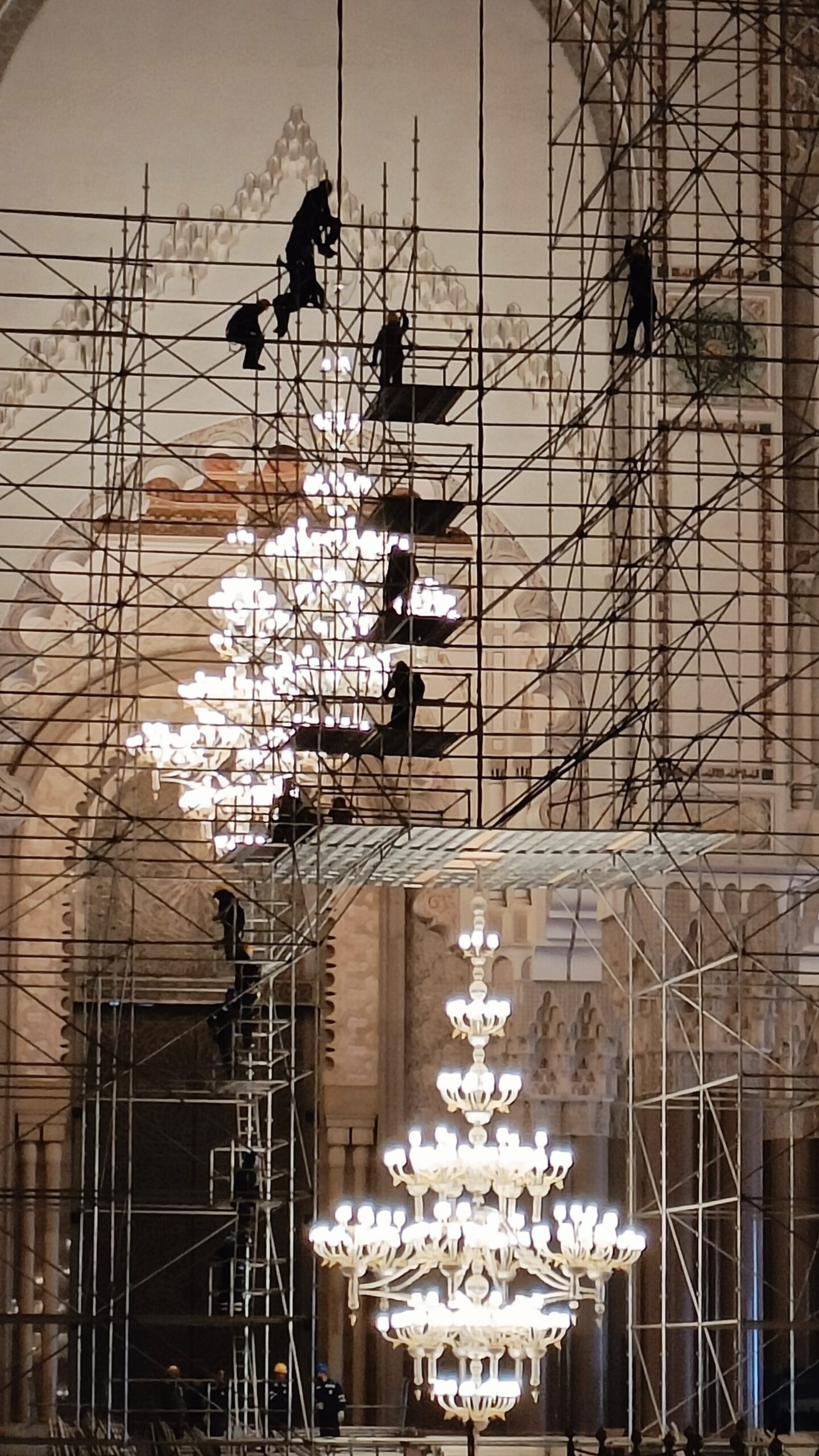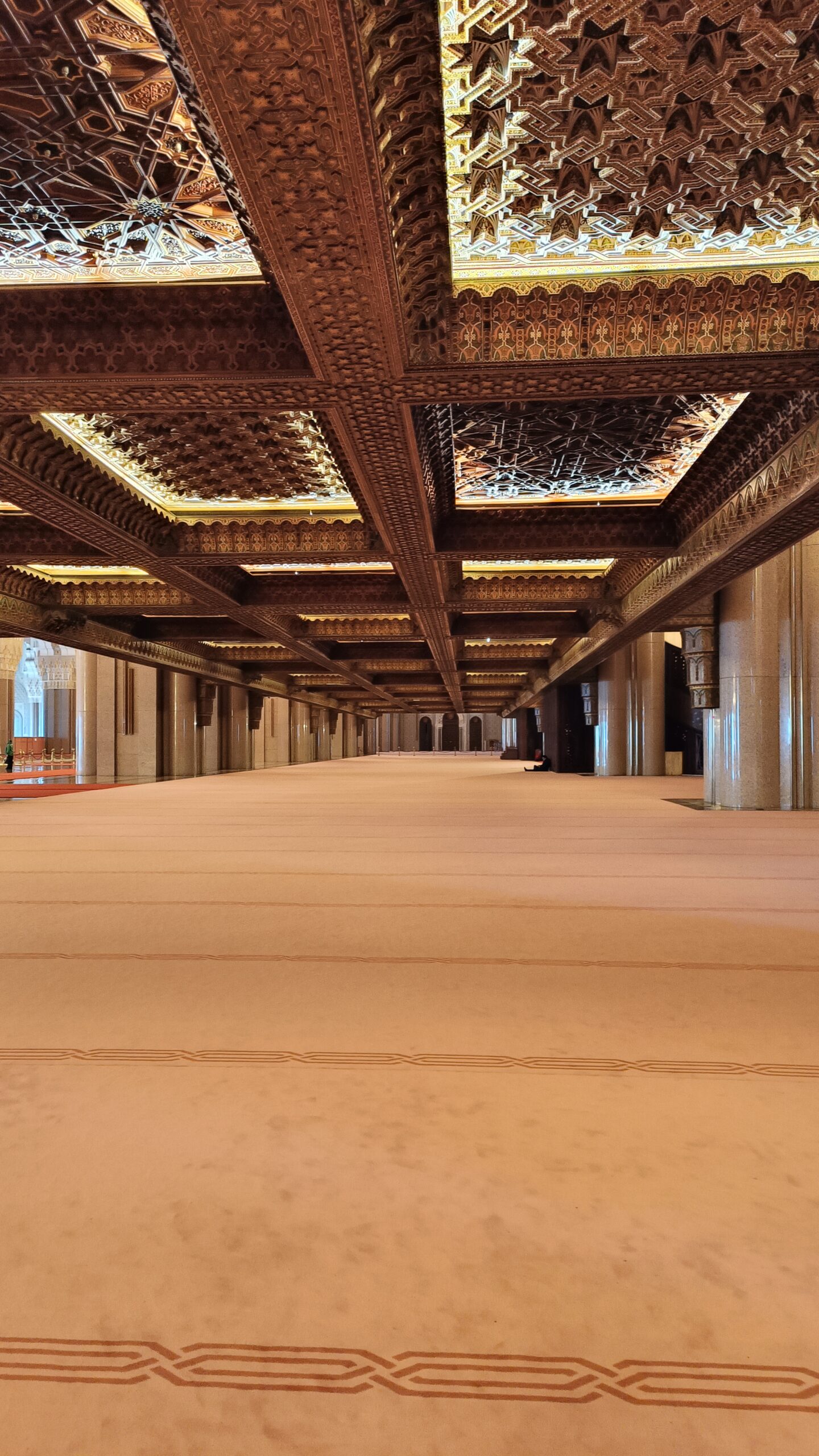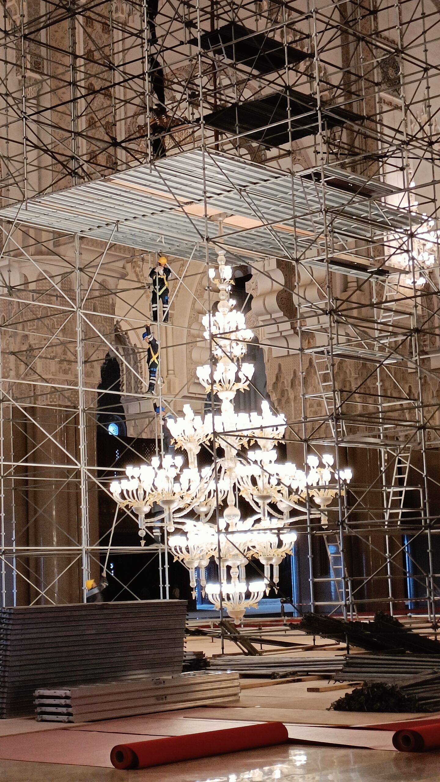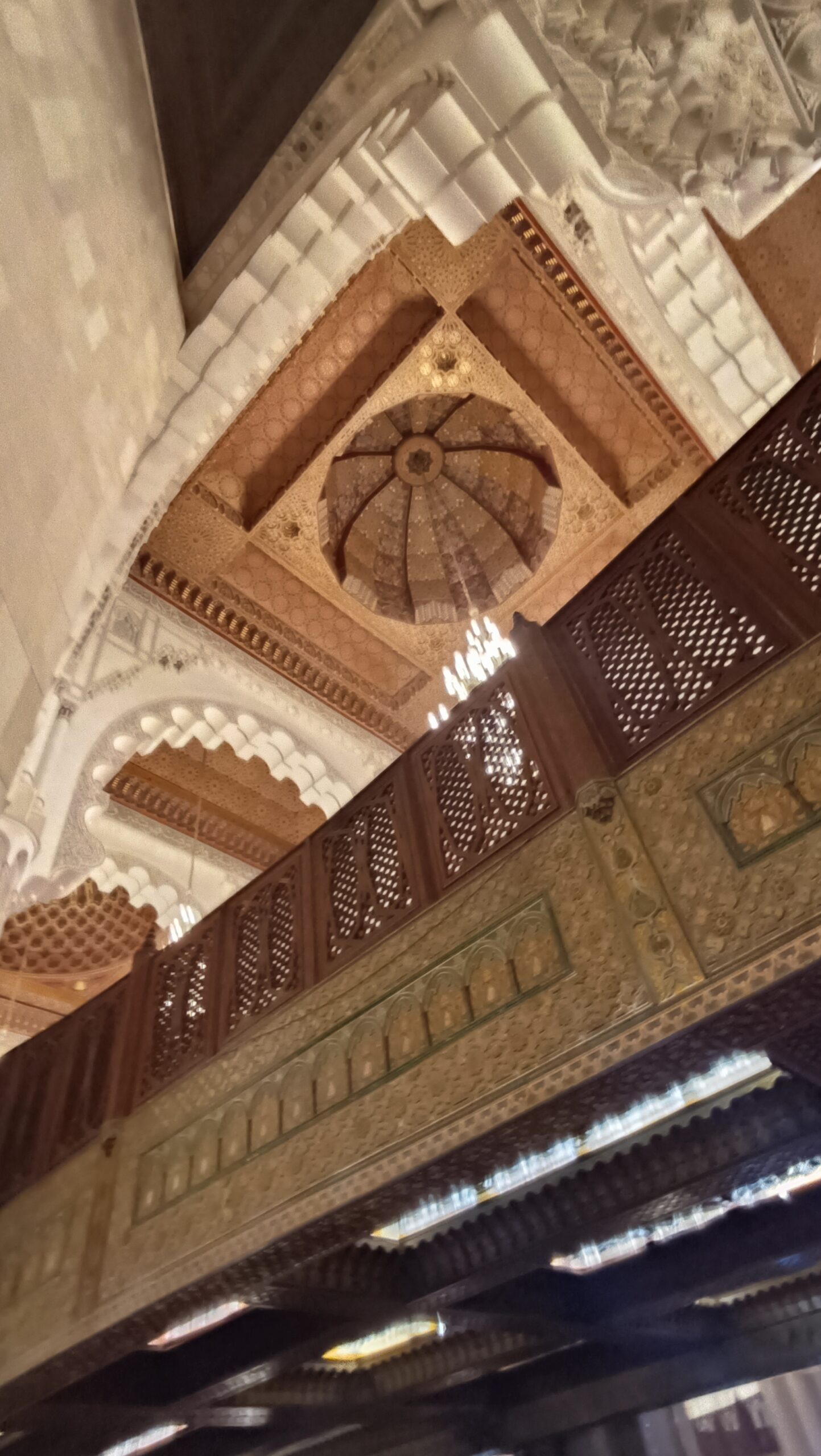 La guida, purtroppo ho scordato il nome, ci ha accompagnato con grande professionalità alla scoperta di questa imponente costruzione super tecnologica. La moschea è dotata di pavimento riscaldato e tetto apribile per i periodi più caldi. Abbiamo assistito alla manutenzione di alcuni lampadari, che visti a terra. da vicino, sono enormi. Per poi visitare la sala della preghiera, immensa con i suoi 20.000 mq, e finemente decorata. Tutti i materiali utilizzati per la costruzione della moschea sono marocchini, come il granito rosa di Agadir e il legno di cedro del Medio Atlante, fatta eccezione per i lampadari di Murano.